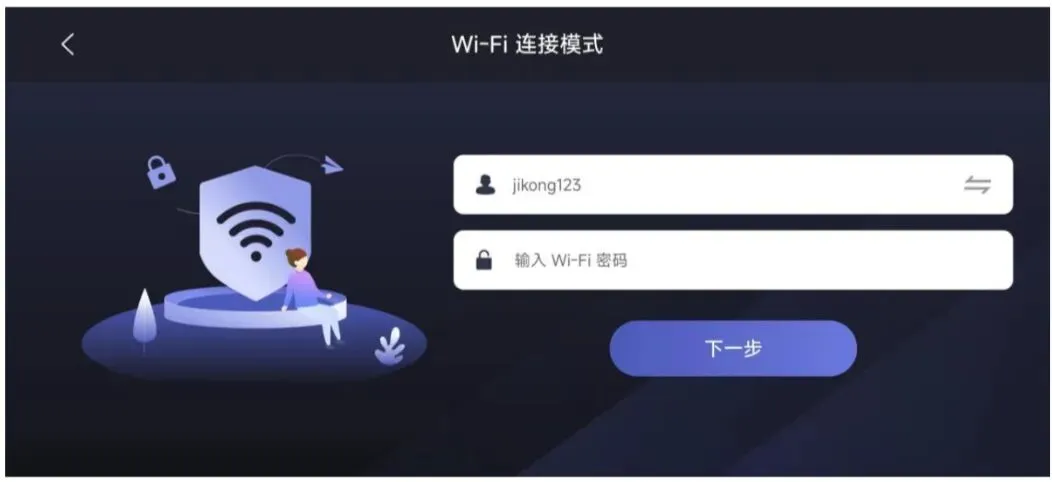 5、连接完成后返回app,此时能够正常显示wifi名称,手动输入wifi密码11111111,点击下一步