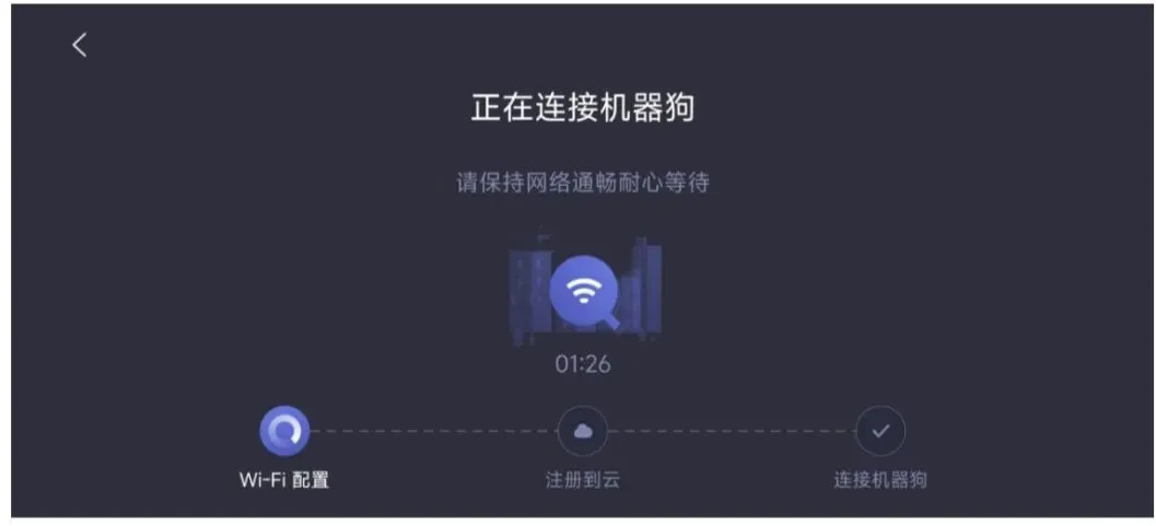 6、正常WIFI配置过程只需要30秒,如果第一步超时失败,检查手机和机器狗是否距离过远以及wifi密码是否输入正确