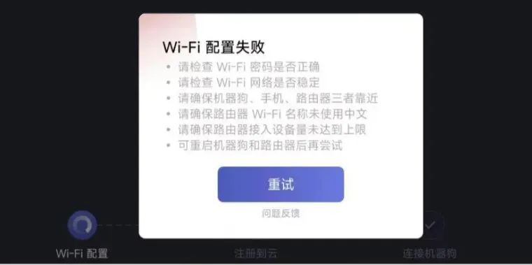 返回上一步检查wifi密码,以及是否和机器狗距离过远。在系统wifi设置里面删除当前wifi,重新打开app进行配网