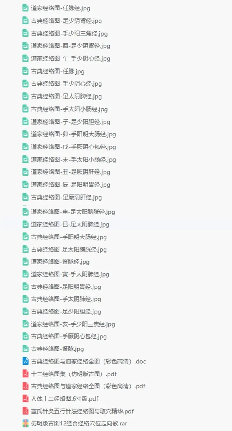 包含道家经络图、古典经络图以及人体十二经络图等多种形式。这套资料以高清图片和详尽的文字说明,深入浅出地展示了经络的走向、穴位分布以及与人体健康的关系。无论是中医爱好者还是专业人士,都能从中获得丰富的知识和灵感