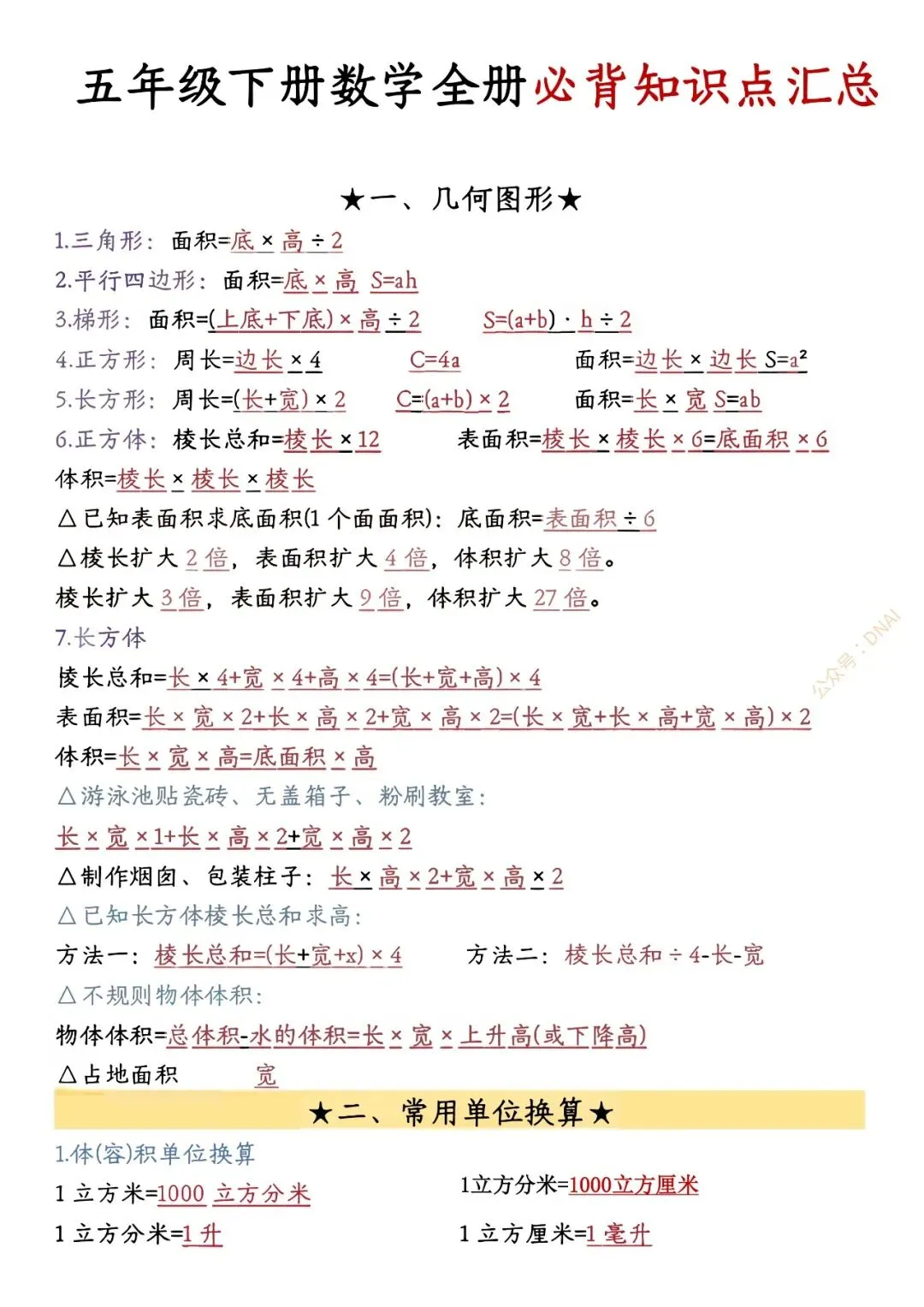 五年级数学下册必背公式总结【