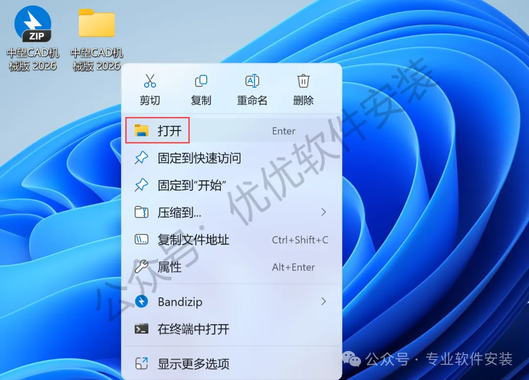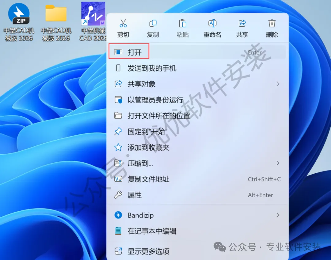 17、回到桌面,右键桌面上的【中望CAD机械版 2026软件图标】,点击【打开】