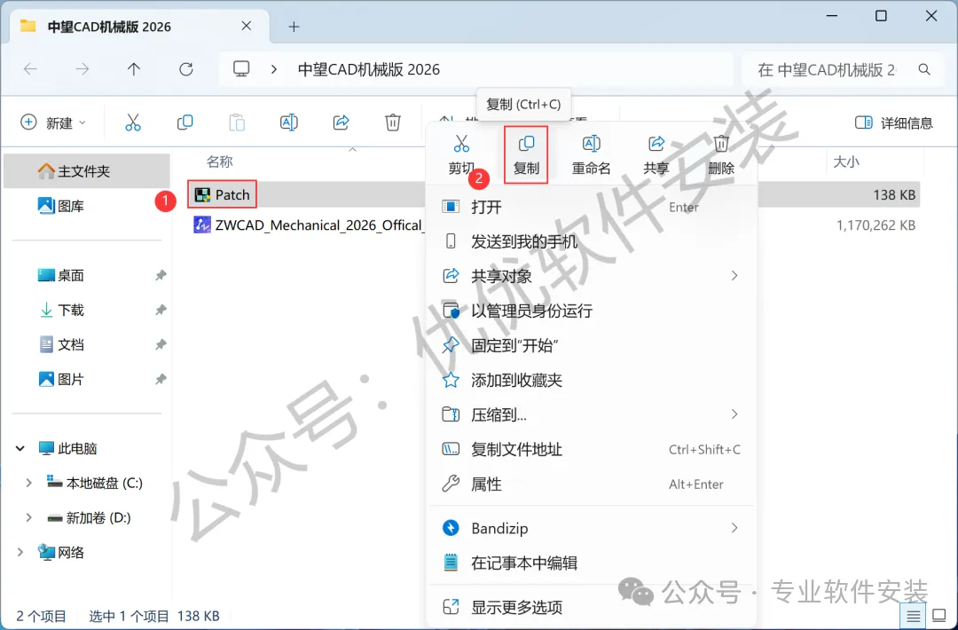 8、回到中望CAD机械版 2026文件夹,找到【Patch】文件,右键点击【复制按钮】