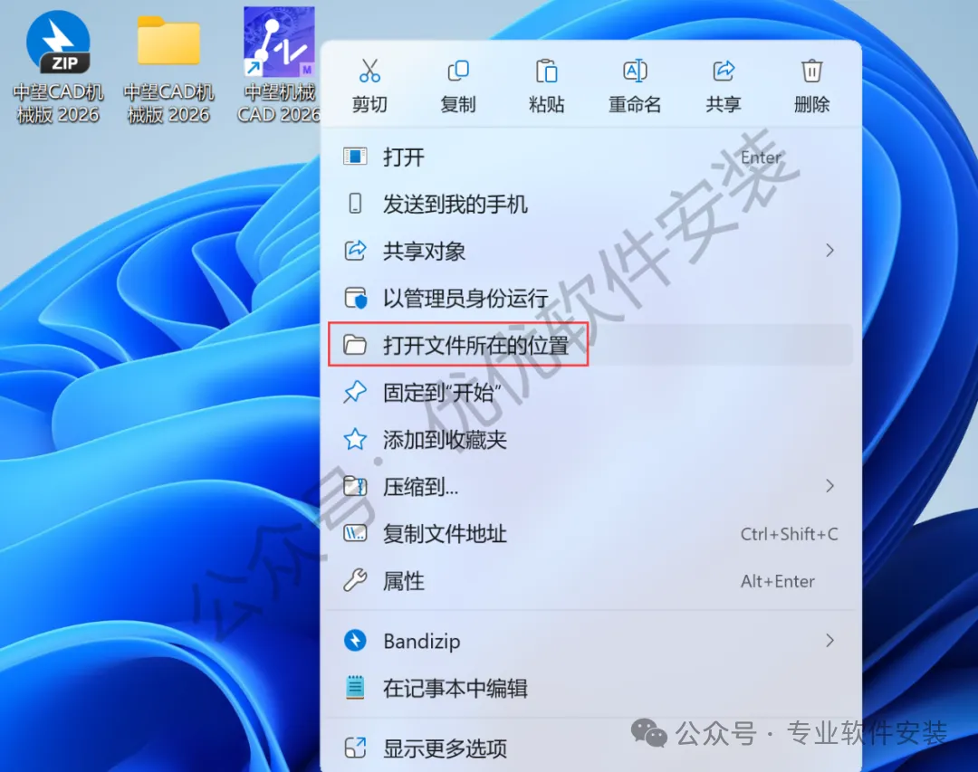 9、回到桌面,右键桌面上的【中望CAD机械版 2026软件图标】,点击【打开文件所在的位置】