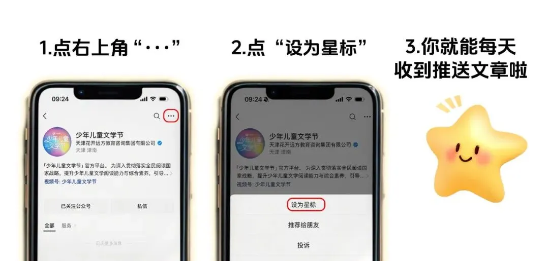 为了不错过文学节的最新活动资讯、报名信息和精彩内容,建议您按照下图操作,点击“少年儿童文学节”公众号名片,将我们设为⭐星标。这样就能第一时间收到文学节的最新动态啦!