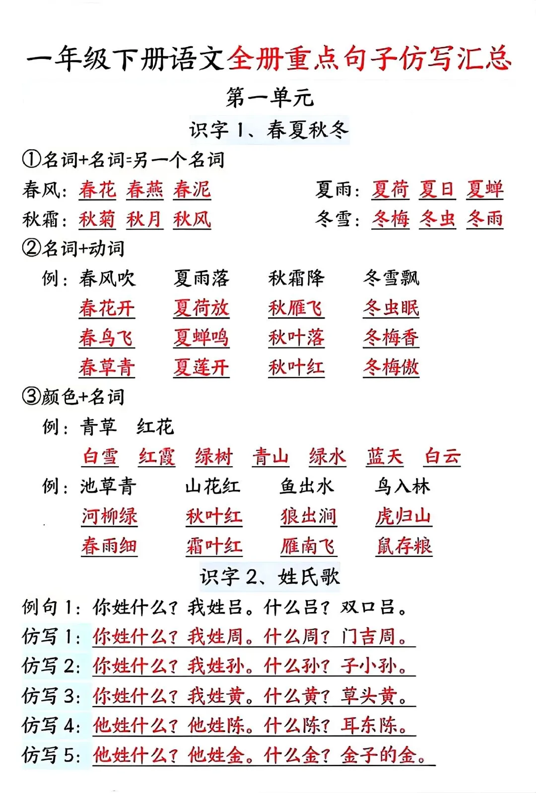 一年级下册的仿写,主要围绕简单句式展开,这些句式不仅出现在课本里,也是单元测试、期中期末考的必考题。孩子熟练掌握后,不仅能稳稳拿到基础分,还能为后续看图写话、短文写作打下扎实的语言功底。