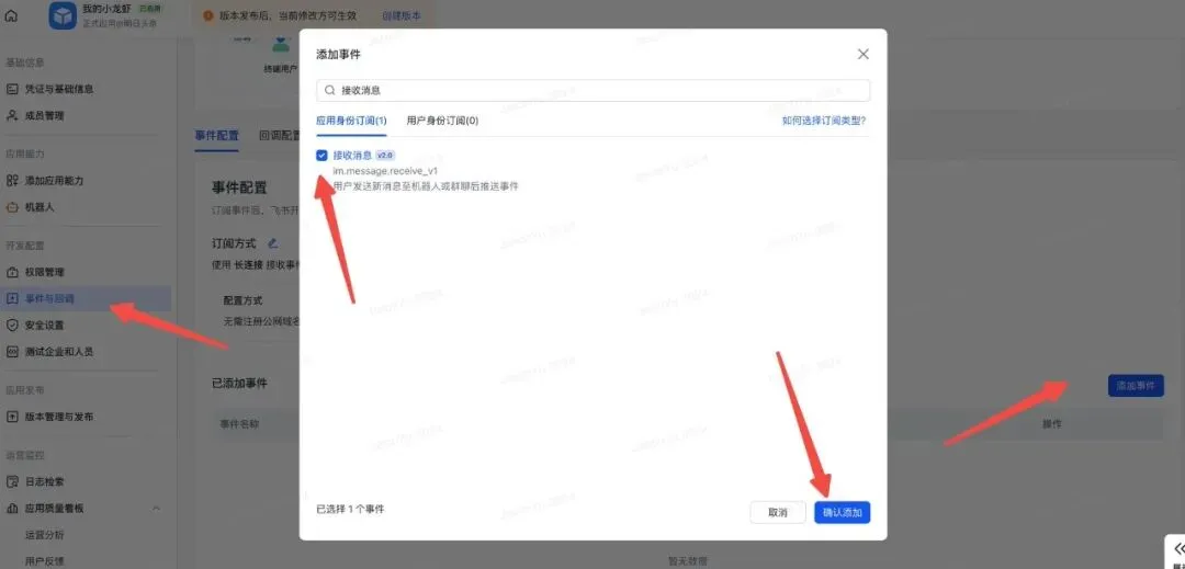 进入飞书开放平台,配置事件订阅方式: