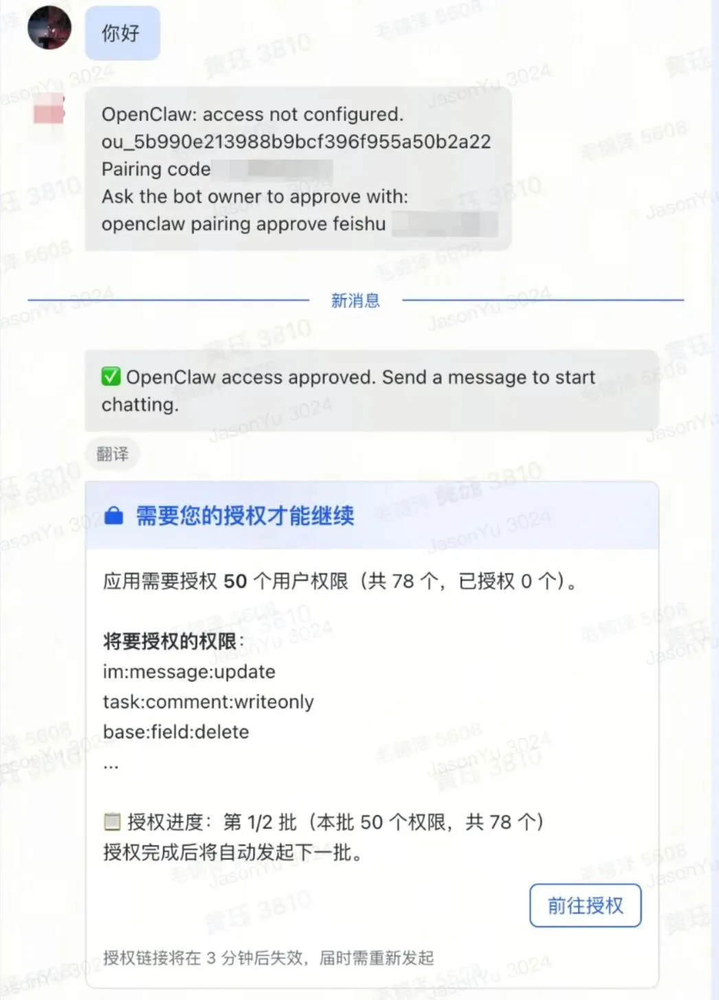 在飞书中向机器人发送任意消息,系统会生成一个配对码 -