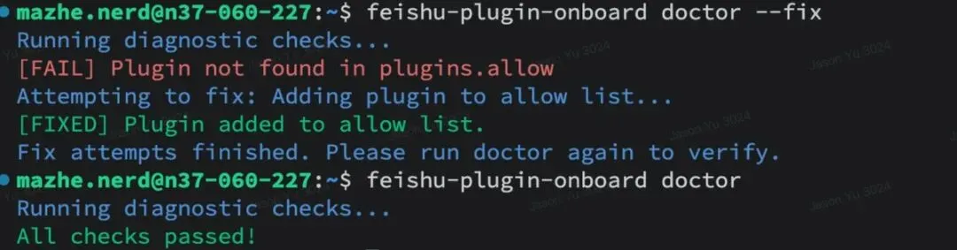 feishu-plugin-onboard doctor --fix