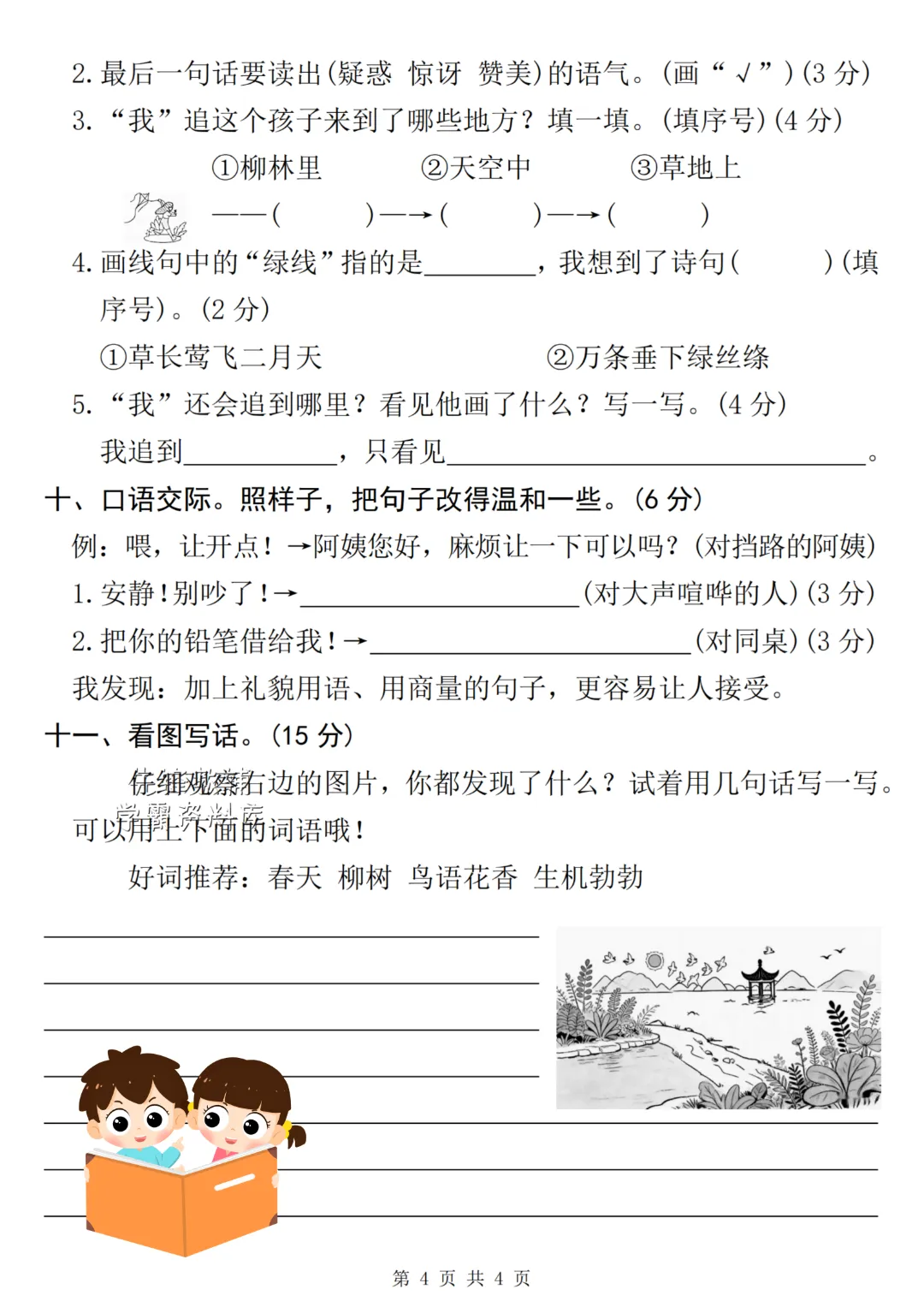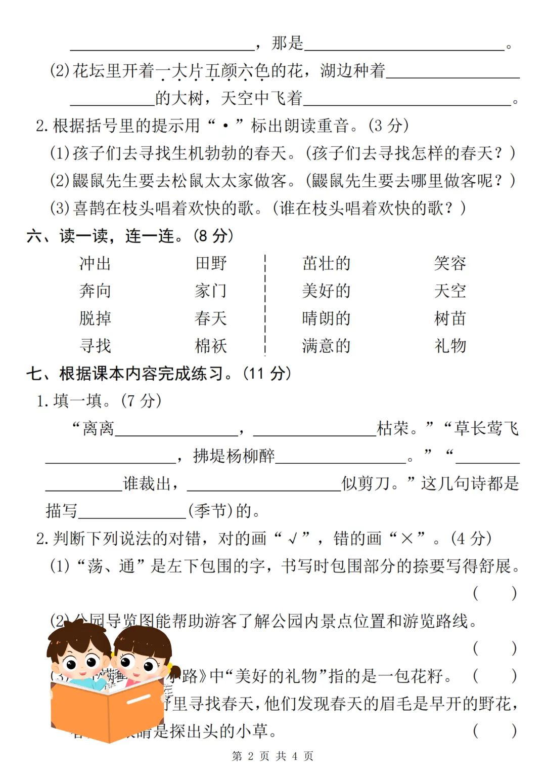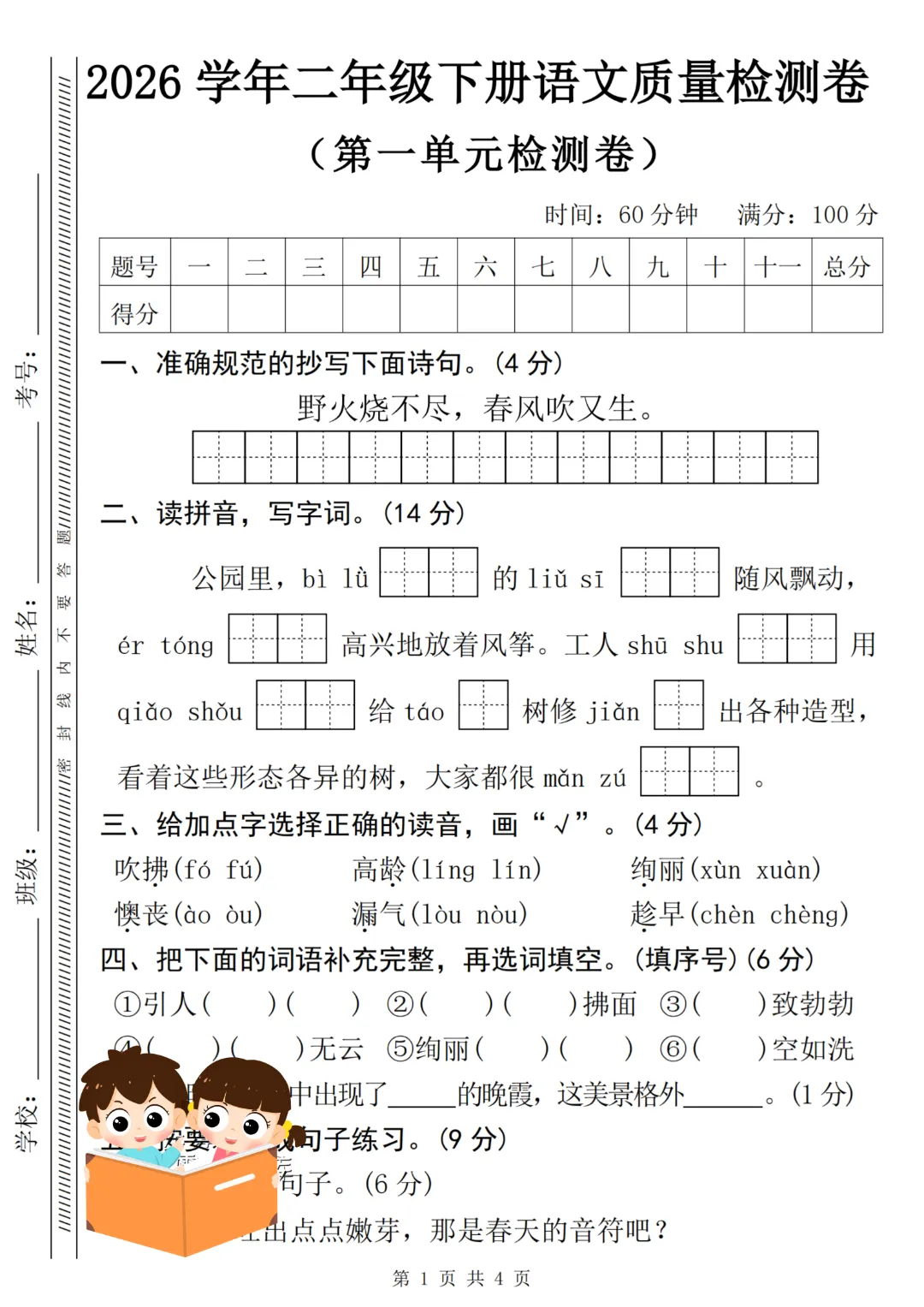 26年春最新版《二年级下册语文第一单元测试卷》电子版可下载打印.