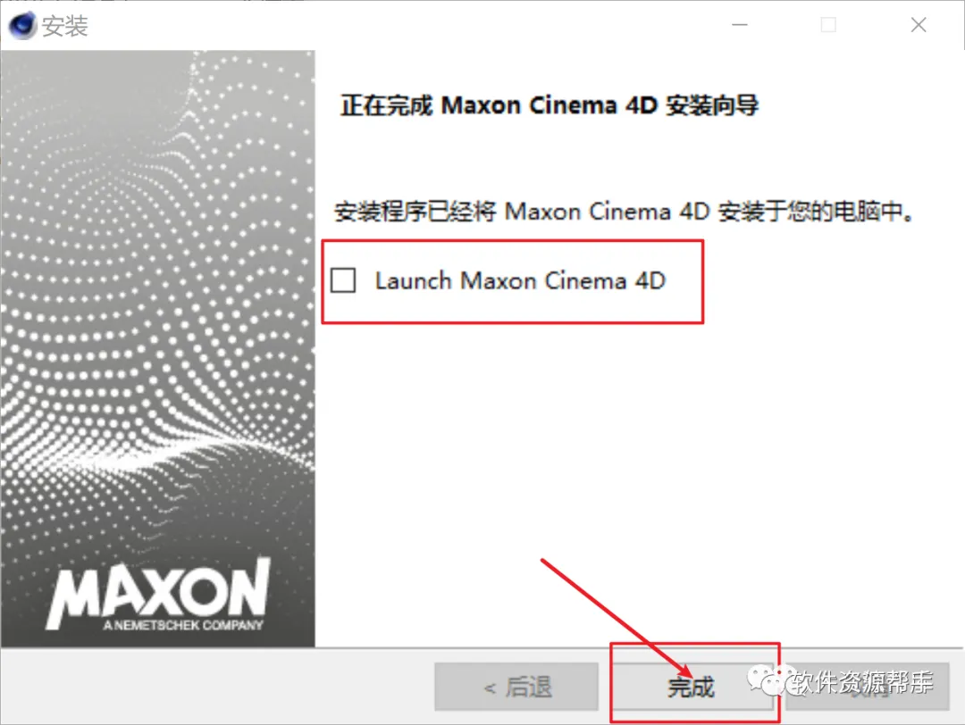 7.先取消“Launch MaxonCinema 4D”选项,然后点击完成。