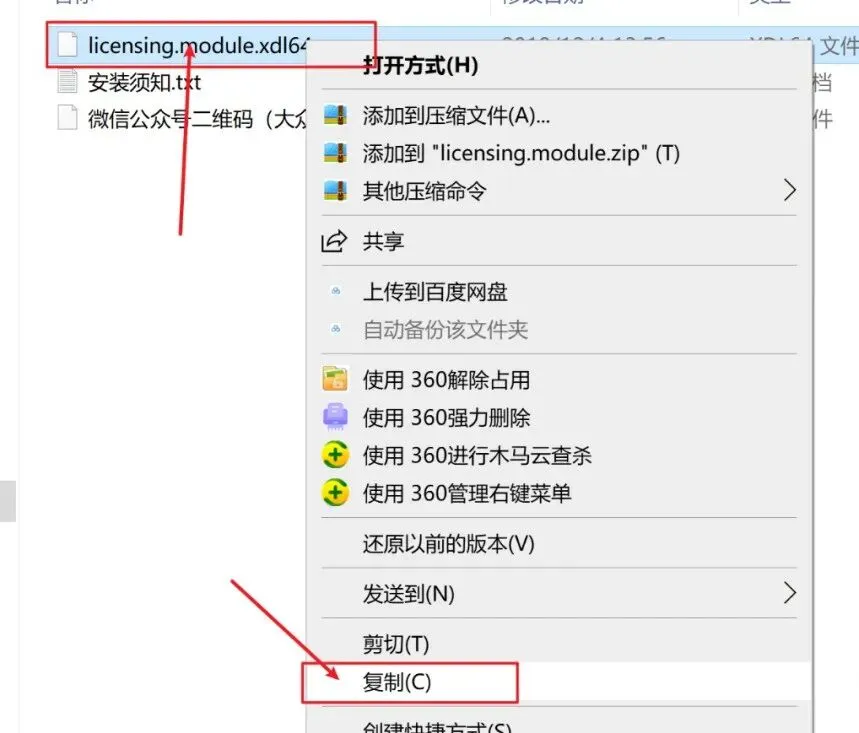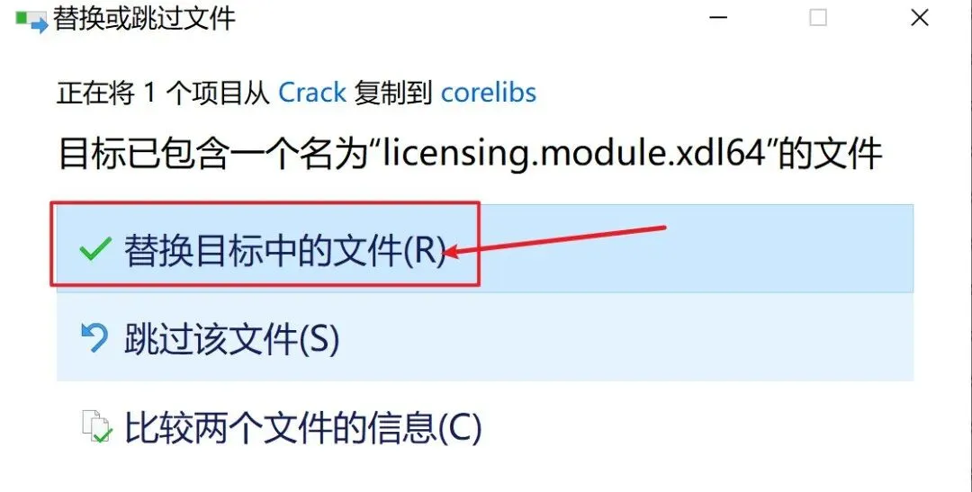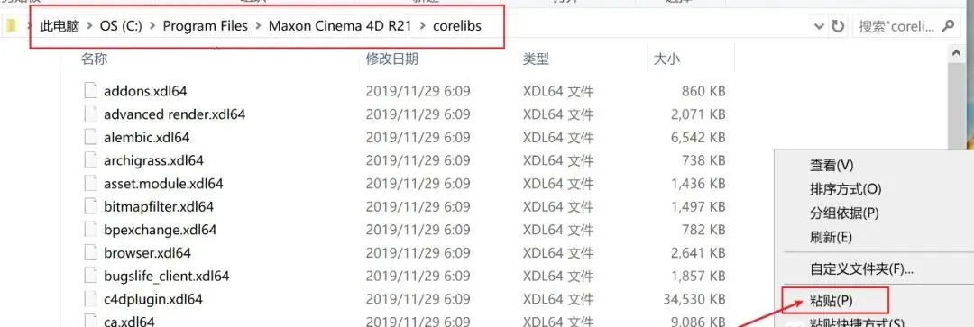 9.找到licensing.module.xdl64,将其复制粘贴到安装目录里面,默认的安装目录在(C/program Flies/Maxon Cinema4D R21/corelibs),点击【粘贴】。(如果改动了安装目录就找到之前改的地方)