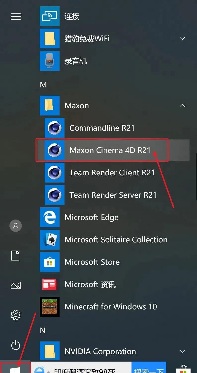11.Win10系统不会创建快捷方式,现在我们打开菜单栏,找到最新下载的Maxon Cinema 4D R21软件,鼠标左击拖拽至桌面,创建桌面快捷方式。
