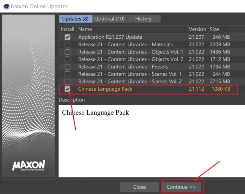 16.首先先取消勾选第一项Application R21.207 Update,然后勾选Chinese Language Pack该选项。点击【Continue】
