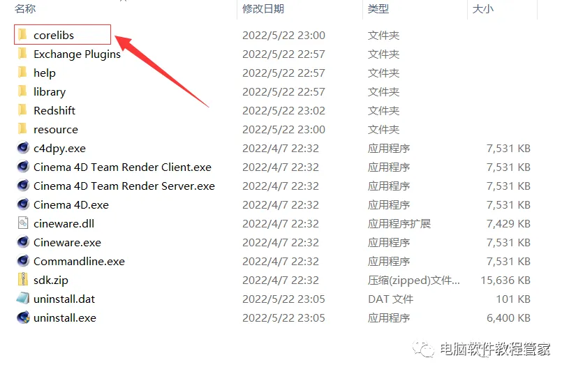 13.打开软件安装目录,即第5步新建的【C4D R26】文件夹,然后双击打开【corelibs】文件夹