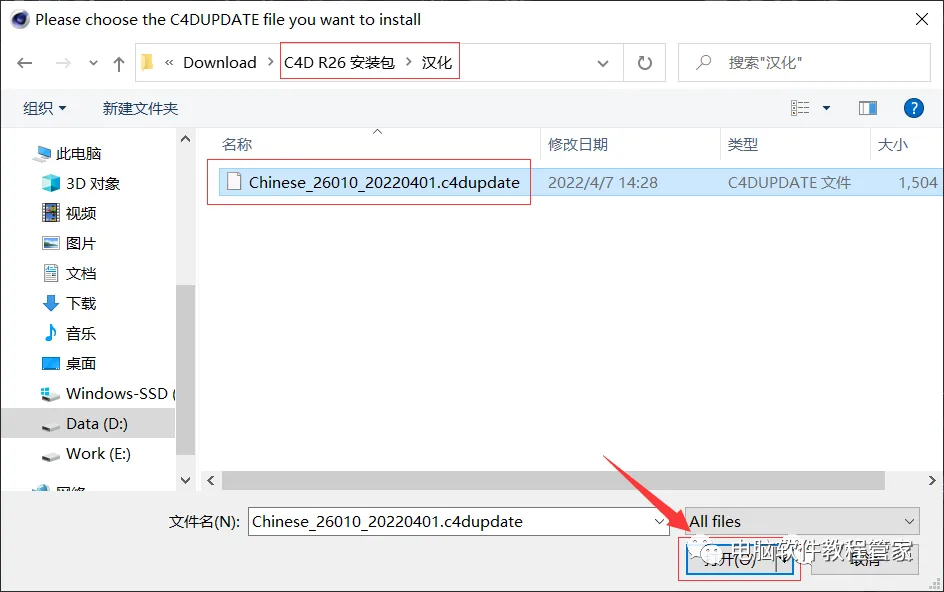 19.在弹出的窗口中,找到第2步打开的【C4D R26 安装包】文件夹中的【汉化】文件夹,并将其打开,然后选中【Chinese_26010_20220401.c4dupdate】文件,点击【打开】