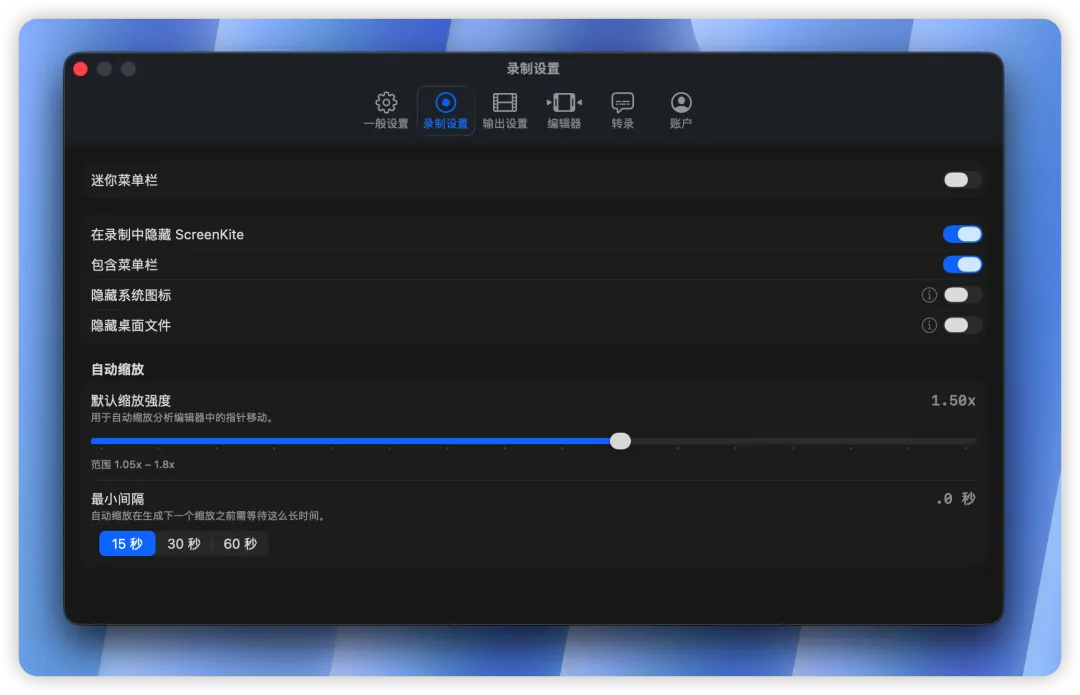 录屏现阶段最实用的一个功能就是自动缩放,它可以直接让你免去剪辑的多任务工程,当然了它也是有这个功能的。在录制设置里面可以选择自动缩放的功能选项。