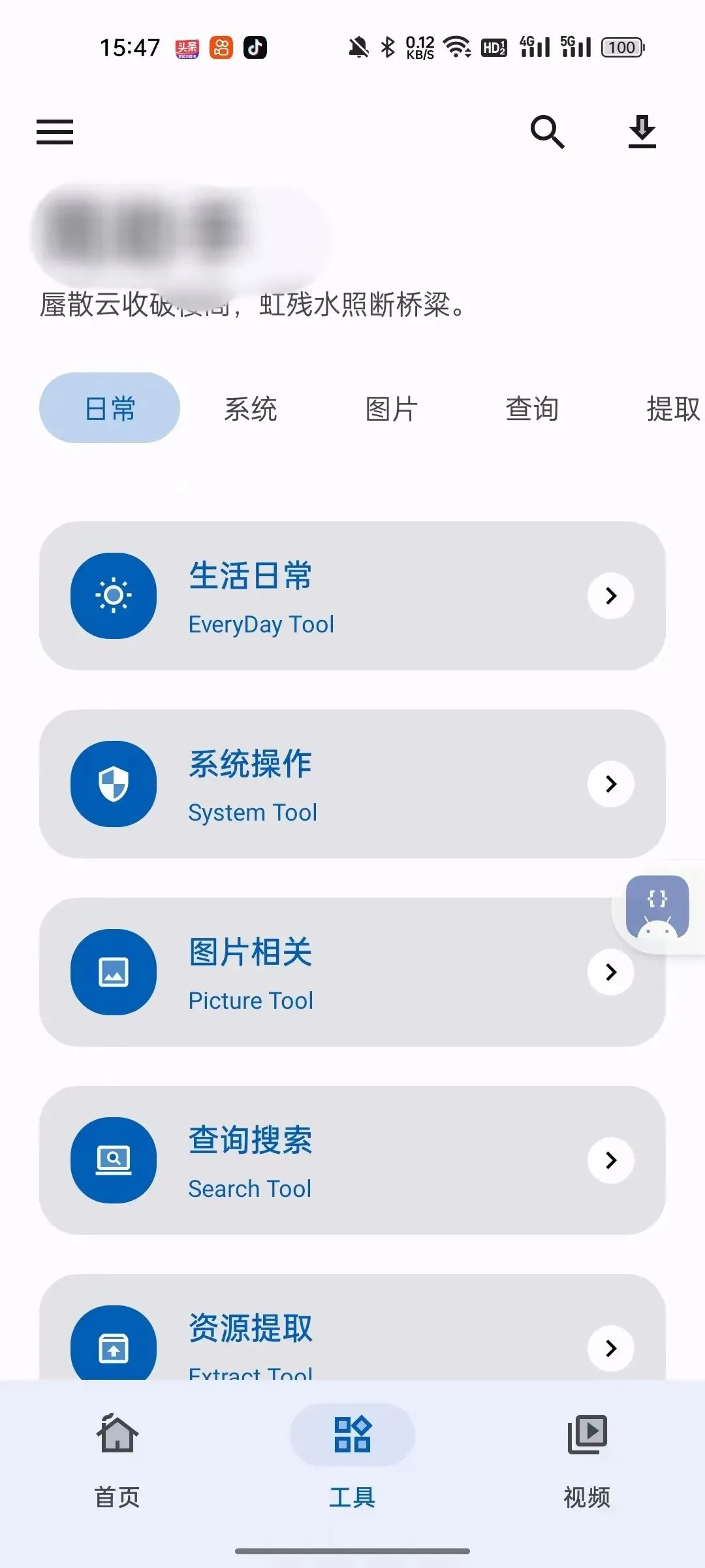 第二页面是工具页面,共有七大类型的工具可供使用,包括日常工具、系统工具、图片工具、查询工具等等,每个分类都有十几个小功能提供使用,像是图片工具,里面有壁纸、头像、图片压缩、加水印等等,都是一些比较实用的小功能。