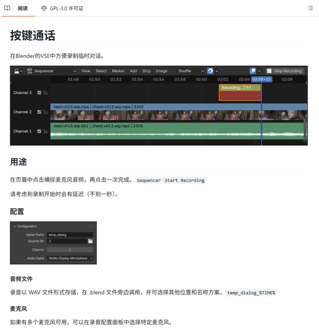 有些小伙伴可能知道,Blender Studio内部其实一直有个叫 “Push to Talk“(按键说话) 的插件在用。按一下录音,再按一下停止,直接在时间线上生成音频条。