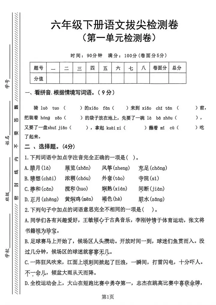 26春六下语文第一单元测试卷|完整电子档可下载打印!