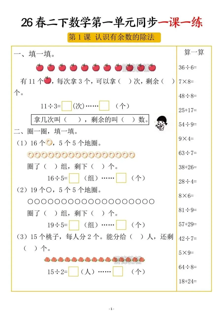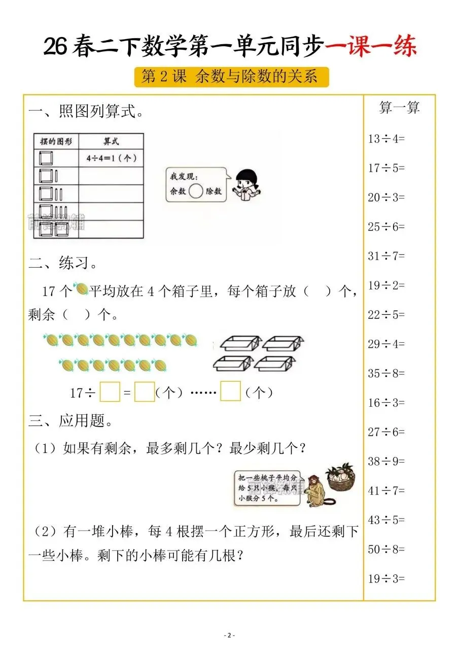 二年级下册数学第一单元“有余数的除法”同步练习,核心知识点可以归纳为以下几个方面: