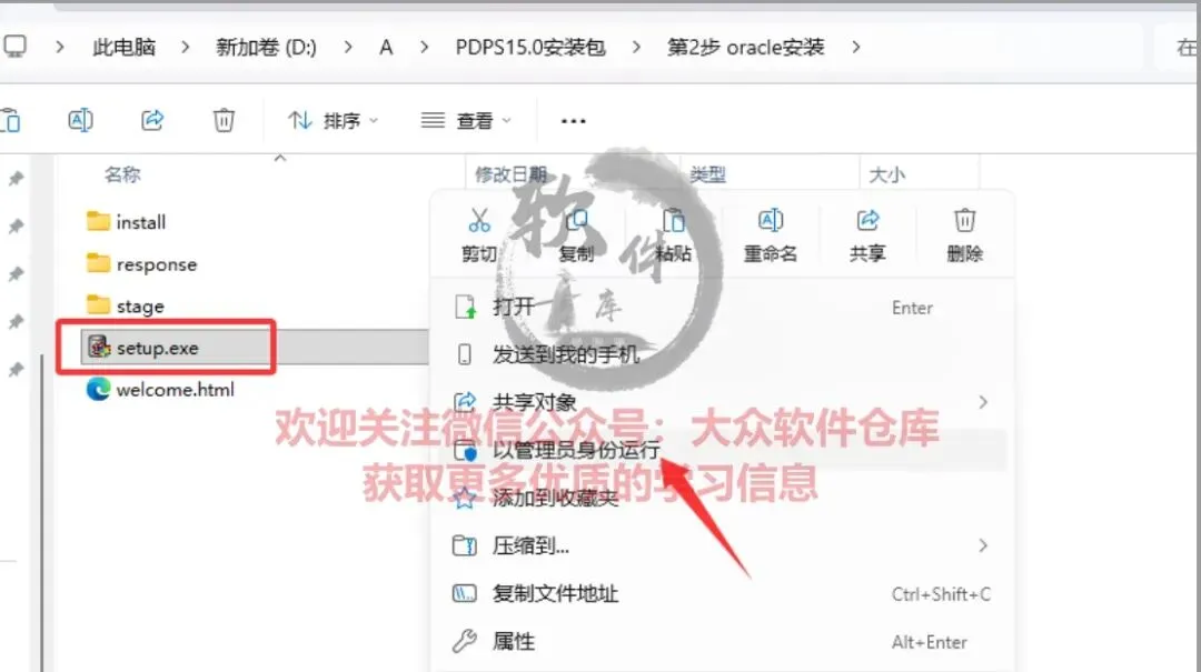 7.双击打开第2步 oracle安装文件夹,管理员身份运行setup程序;