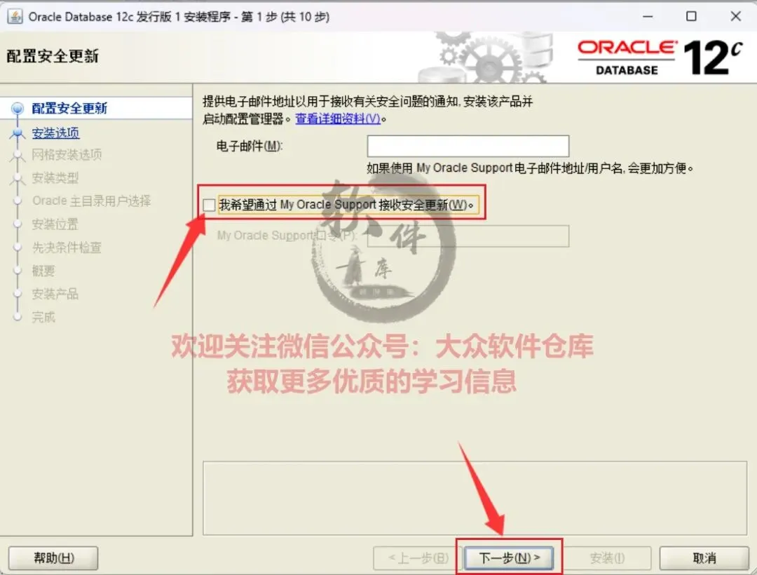 9.取消勾选安全更新选项,点击下一步;