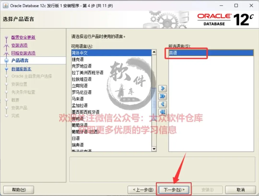 13.产品语言,仅保留英语。然后点击下一步。