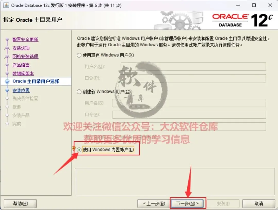 15.勾选使用Windows内置账户,然后的点击下一步。