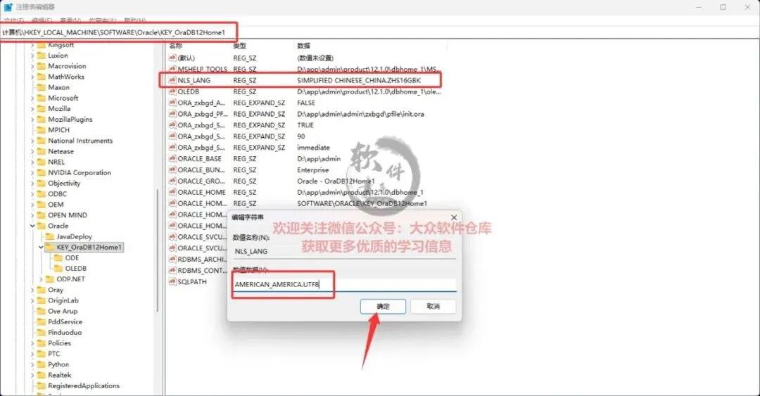37.修改“HKEY_LOCAL_MACHINE\SOFTWARE\Oracle\KEY_OraDB12Home1” 路径下的”NLS_LANG”的键值。双击打开编辑窗口,数值数据栏输入“AMERICAN_AMERICA.UTF8”;