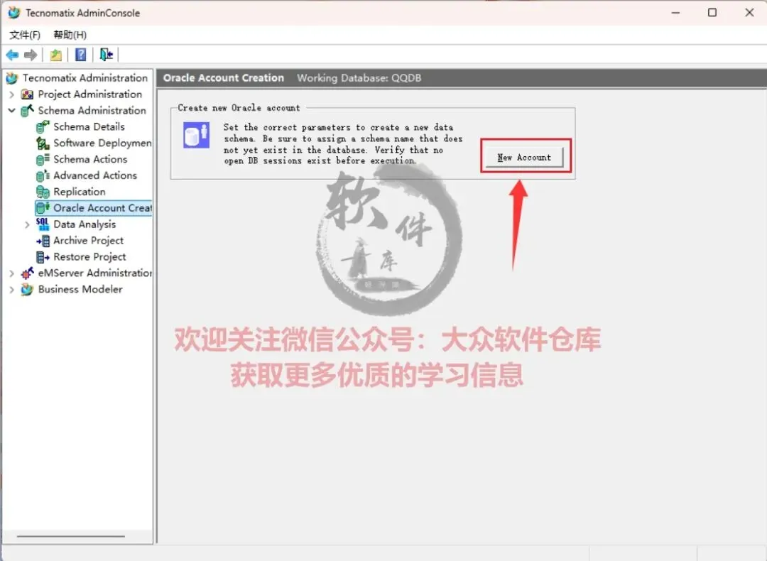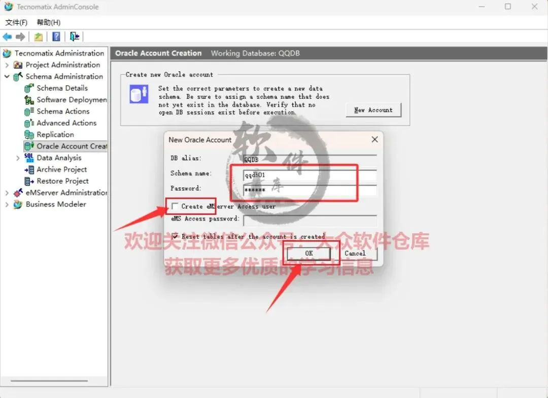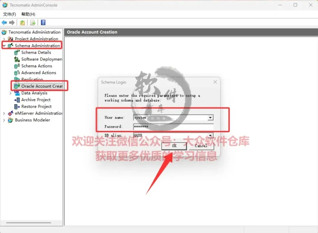 65.点击Schema Administrator→Oracle Account Creation,输入用户名:system,密码:manager,点击OK;