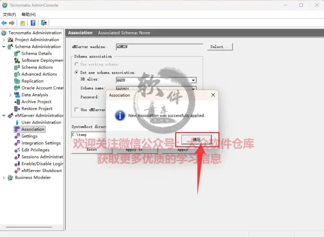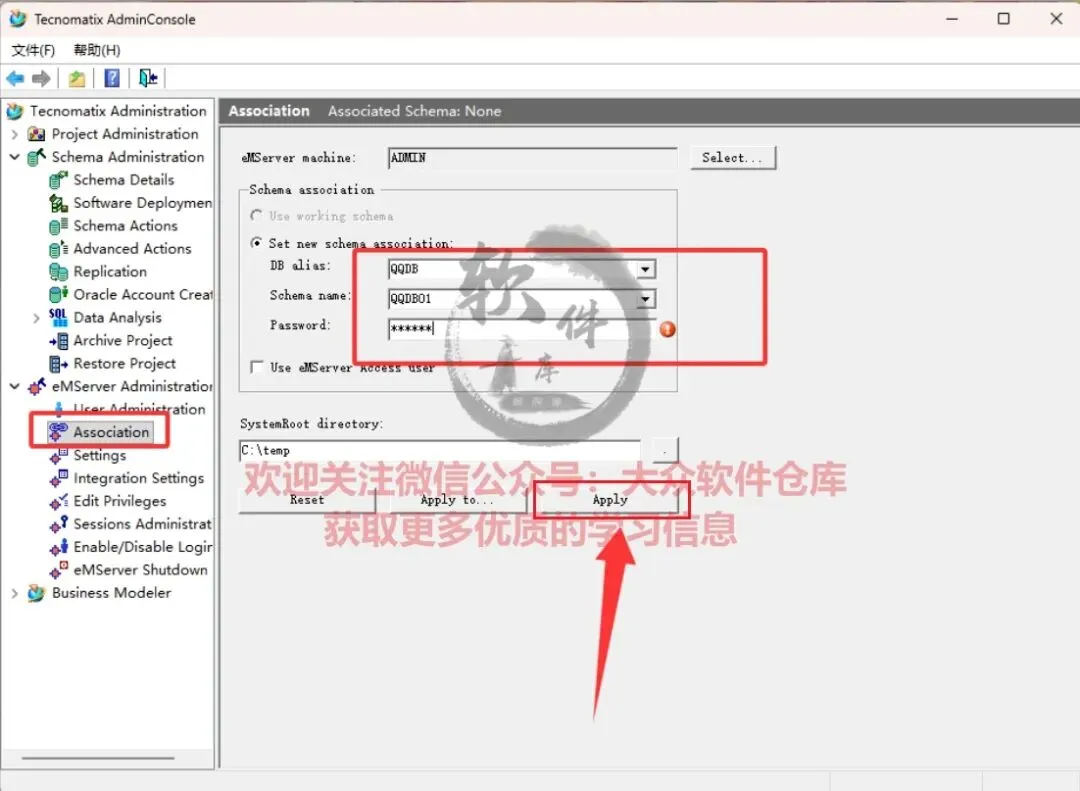 72.选择Association项,选择表空间,输入密码,点击Apply;