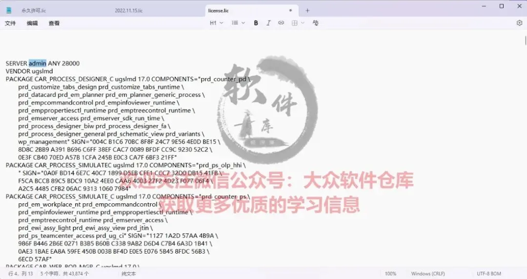 75.许可证安装,license信息更改。返回安装包,双击打开6.安装许可教程\永久许可安装文件夹,打开license文件将admin替换为自己的电脑计算机名。然后保存文件备用。(右键此电脑选择属性可查看自身电脑的计算机名)