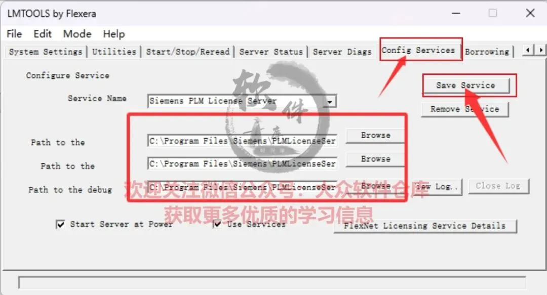 84.点击上方的Config Services,Service Name选择Siemens PLM License Server,(如果下方三个为空,则依次点击Browse选择PLMLicenseServer安装文件夹下的显示文件即可),最后点击save service;
