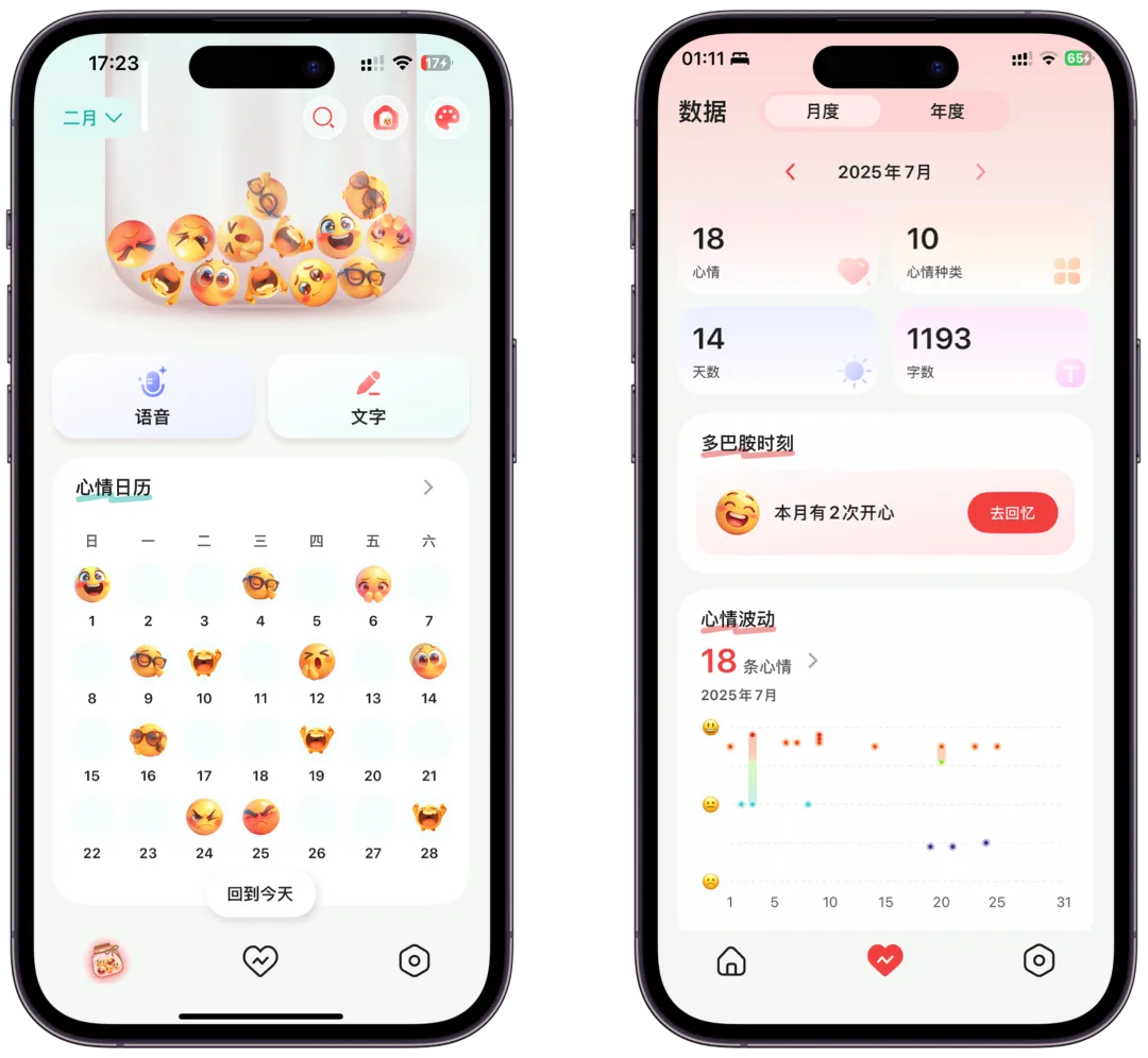 例如日历视图、柱状图等形式,可以清楚看到情绪的变化轨迹。