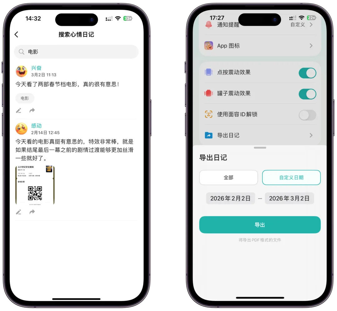 同时还提供搜索和批量导出功能,方便长期保存和整理自己的日记内容。