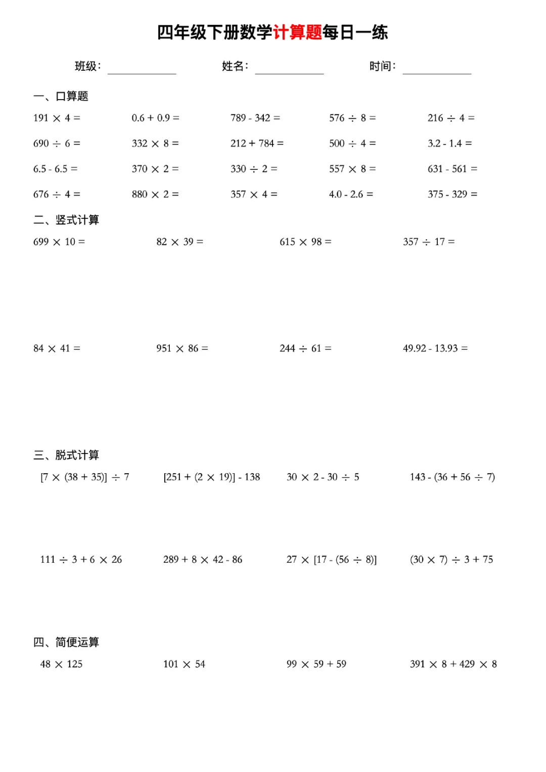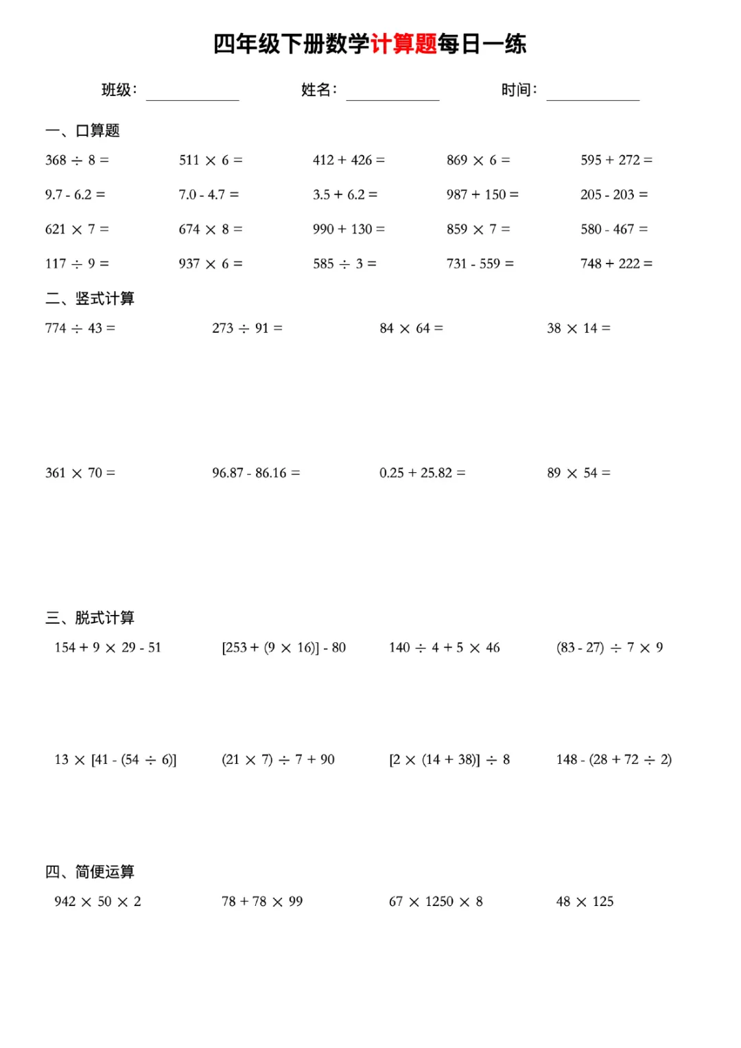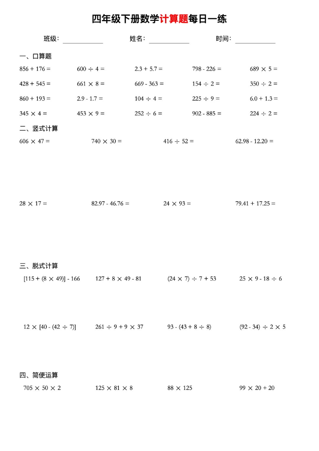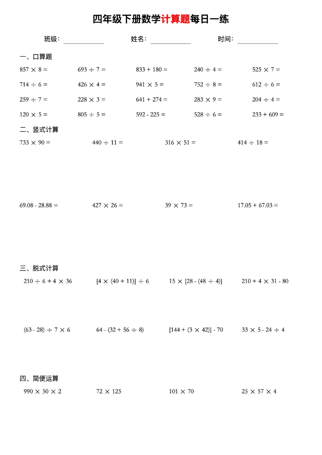 四下数学计算题每日一练人教版可打印带答案