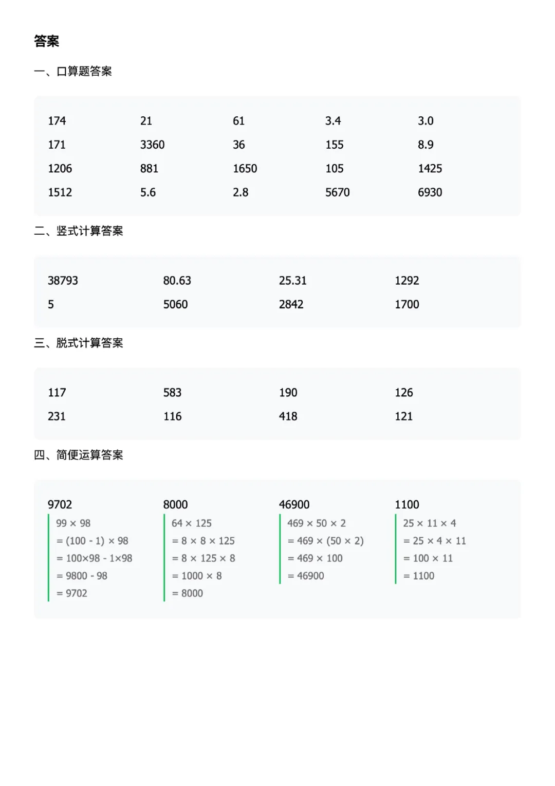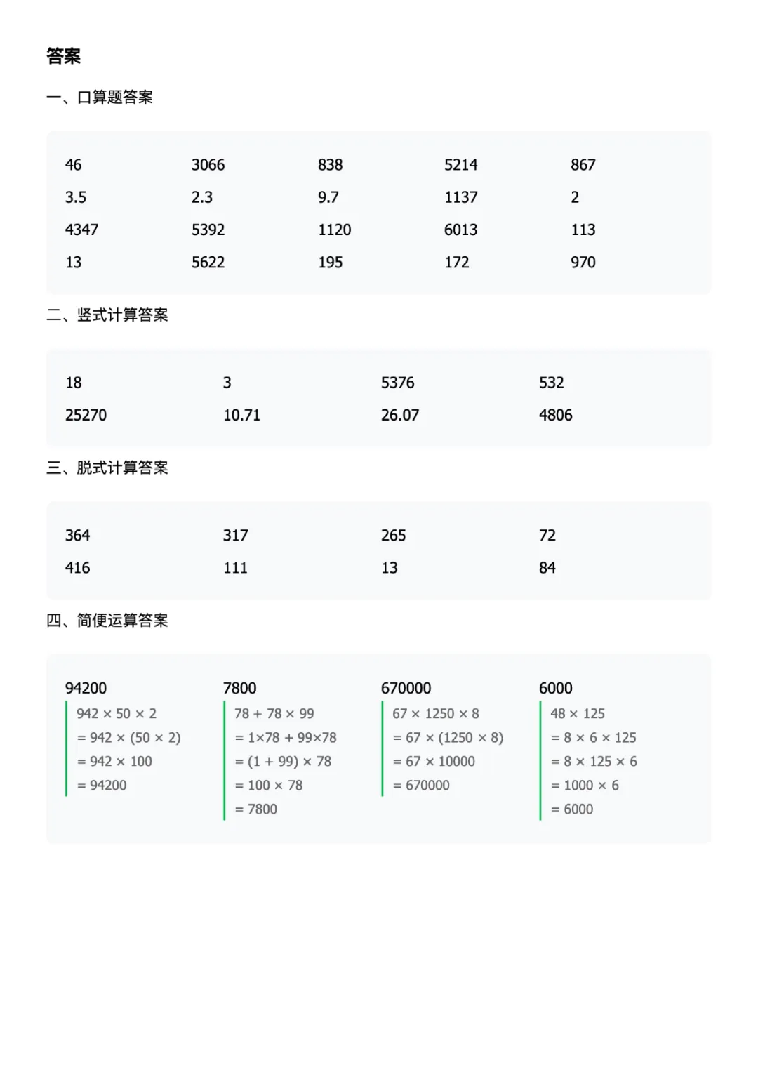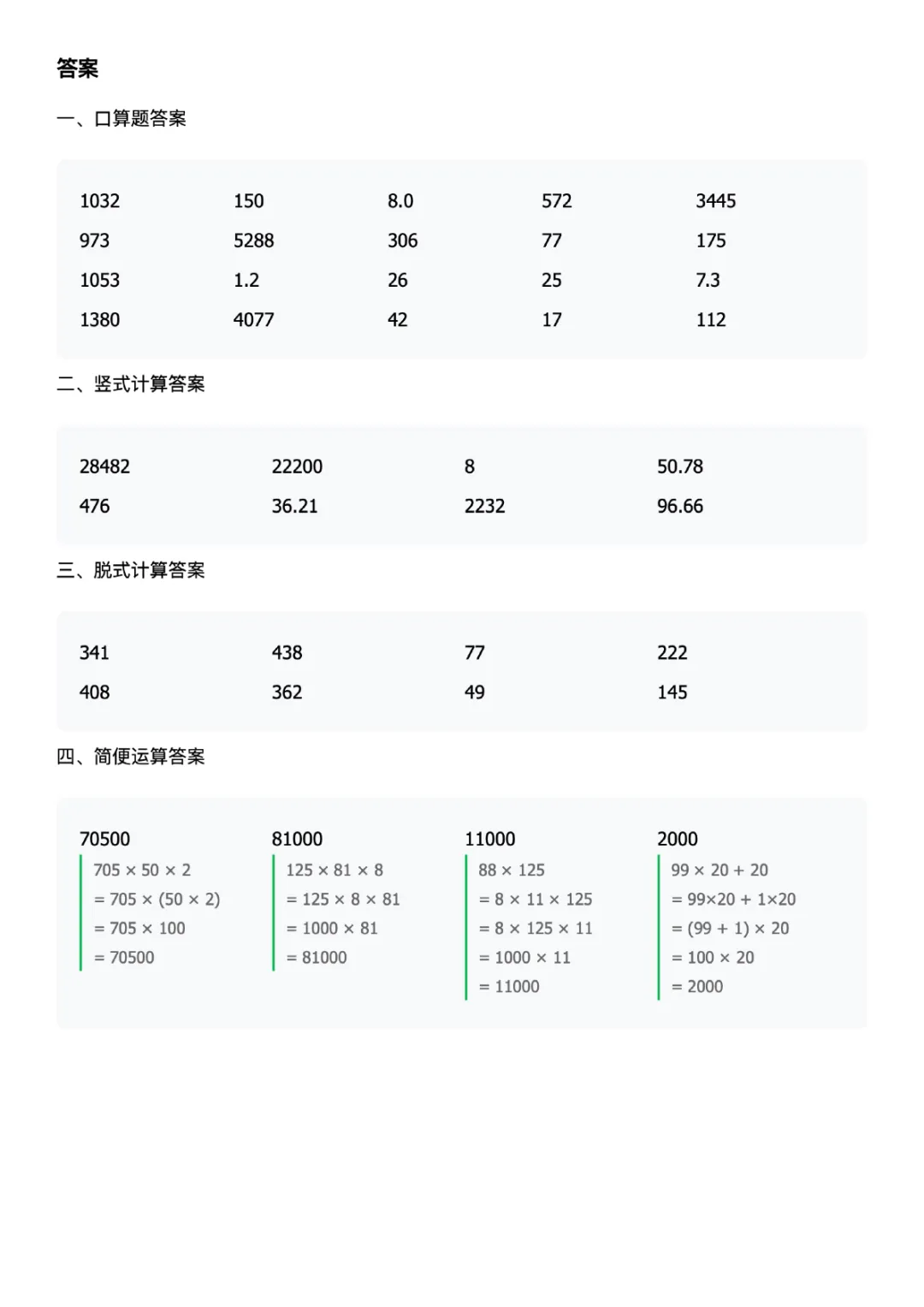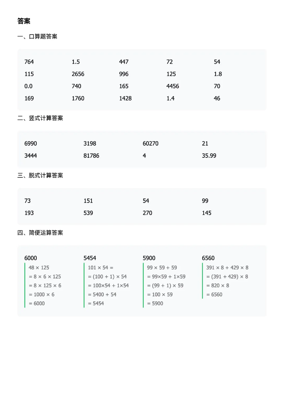 四下数学计算题每日一练人教版可打印带答案