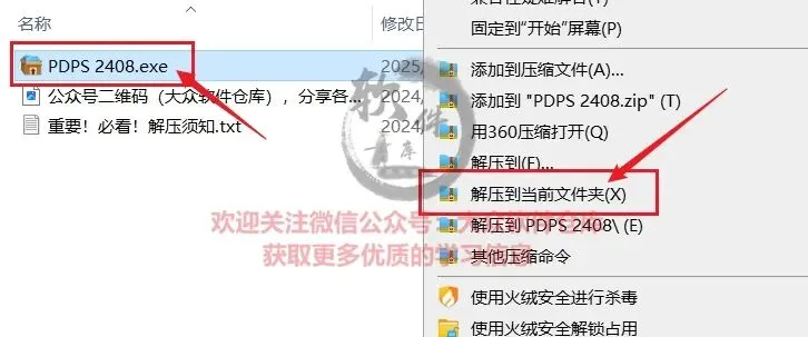 1.把资源从网盘里面下载到电脑上面,并右键PDPS 2408.exe压缩包解压到当前文件夹;