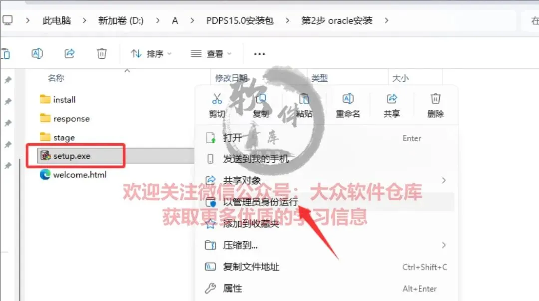 7.双击打开第2步 oracle安装文件夹,管理员身份运行setup程序;