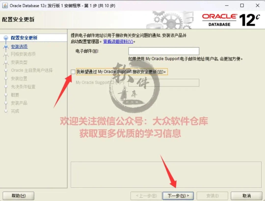 9.取消勾选安全更新选项,点击下一步;