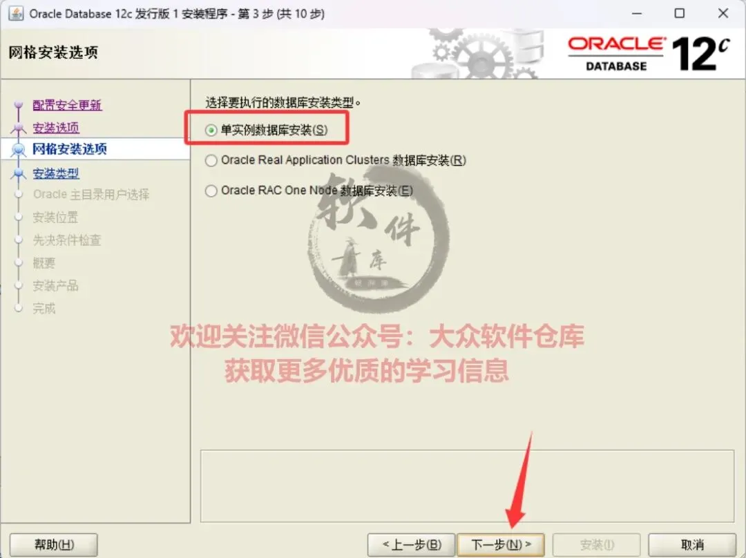 12.选择单实例数据库安装,点击下一步;