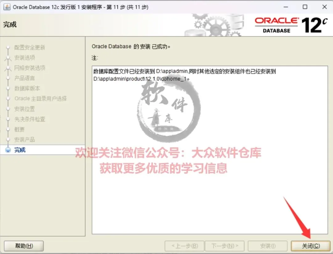 20.数据库安装结束,点击关闭。