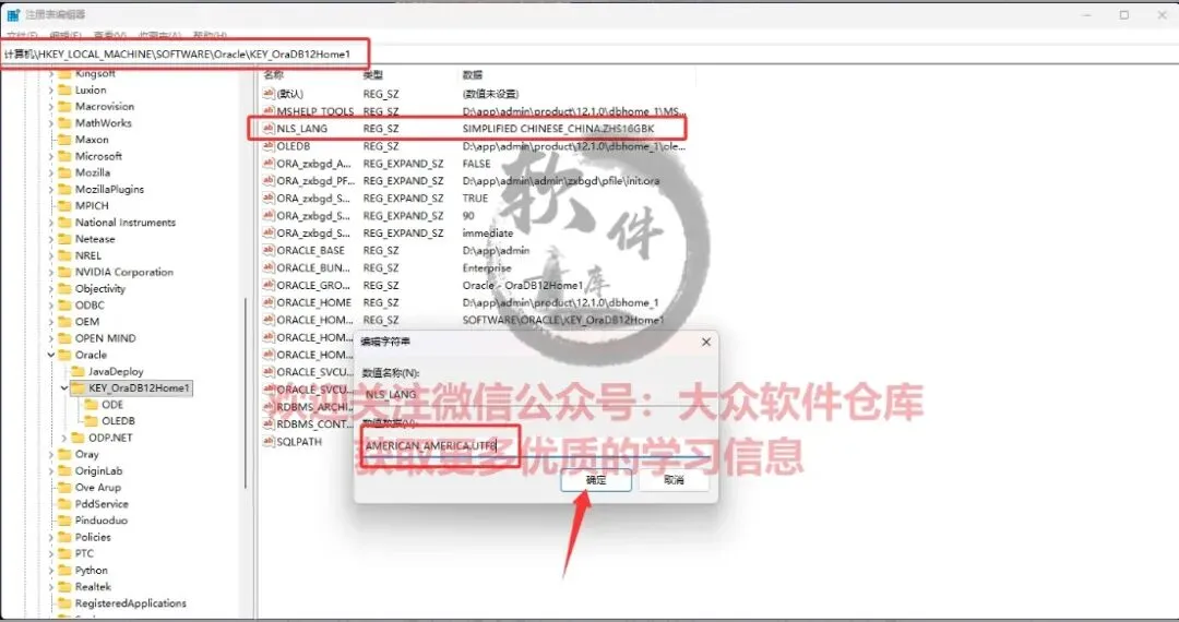 37.修改“HKEY_LOCAL_MACHINE\SOFTWARE\Oracle\KEY_OraDB12Home1” 路径下的”NLS_LANG”的键值。双击打开编辑窗口,数值数据栏输入“AMERICAN_AMERICA.UTF8”;