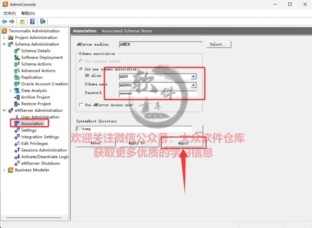 72.选择Association项,选择表空间,输入密码,点击Apply;