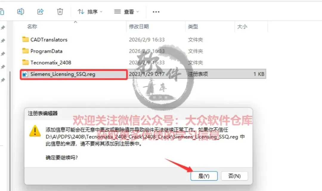 81.返回安装包的6.补丁文件\2408_Crack文件夹,双击运行Siemens_Licensing_SSQ.reg注册表文件。依次点击是,点击确定;