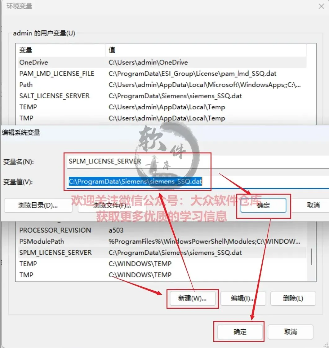 82.右键此电脑选择属性,点击高级系统设置,点击环境变量,新建系统变量,变量名:【SPLM_LICENSE_SERVER】,变量值:【C:\ProgramData\Siemens\siemens_SSQ.dat】,依次点击确定保存;
