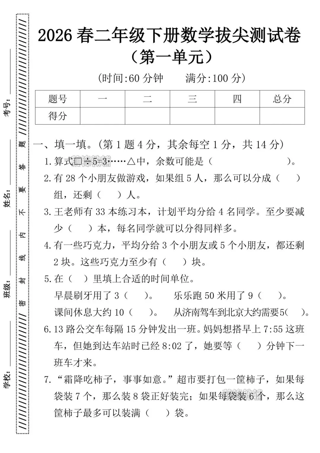 老师刚整理的!二年级下册数学第一单元拔尖测试卷(共5页)!家长看文末领取方式,给孩子领回去打印出来练习吧!