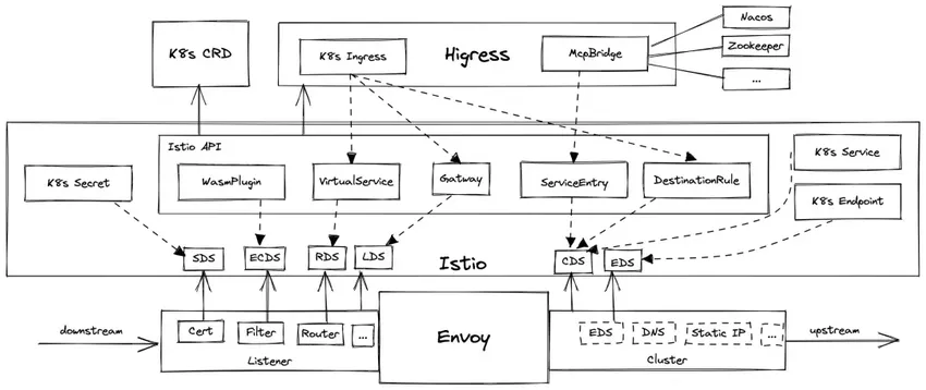 K8s Ingress -> Istio API -> xDS,再实现配置下发;higress-controller 有两个容器,作用如下: