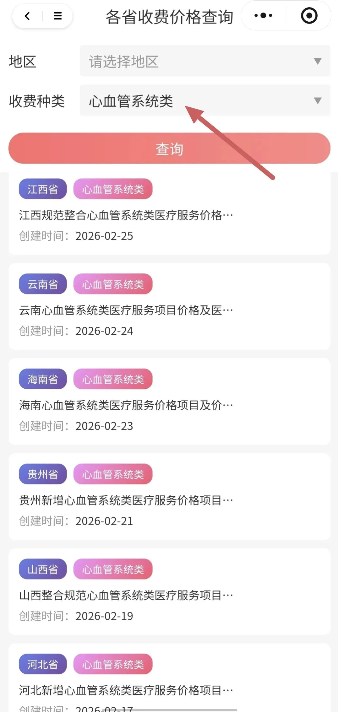 以心血管类的医疗服务价格为例,只需要选择“心血管”这个类目,就可以快速获得几十个省的心血管收费文件,效率提高10倍不止!